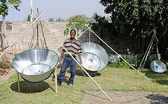 Alberto with 3 solar cookers. The larger ones have a power of about a kiloWatt.